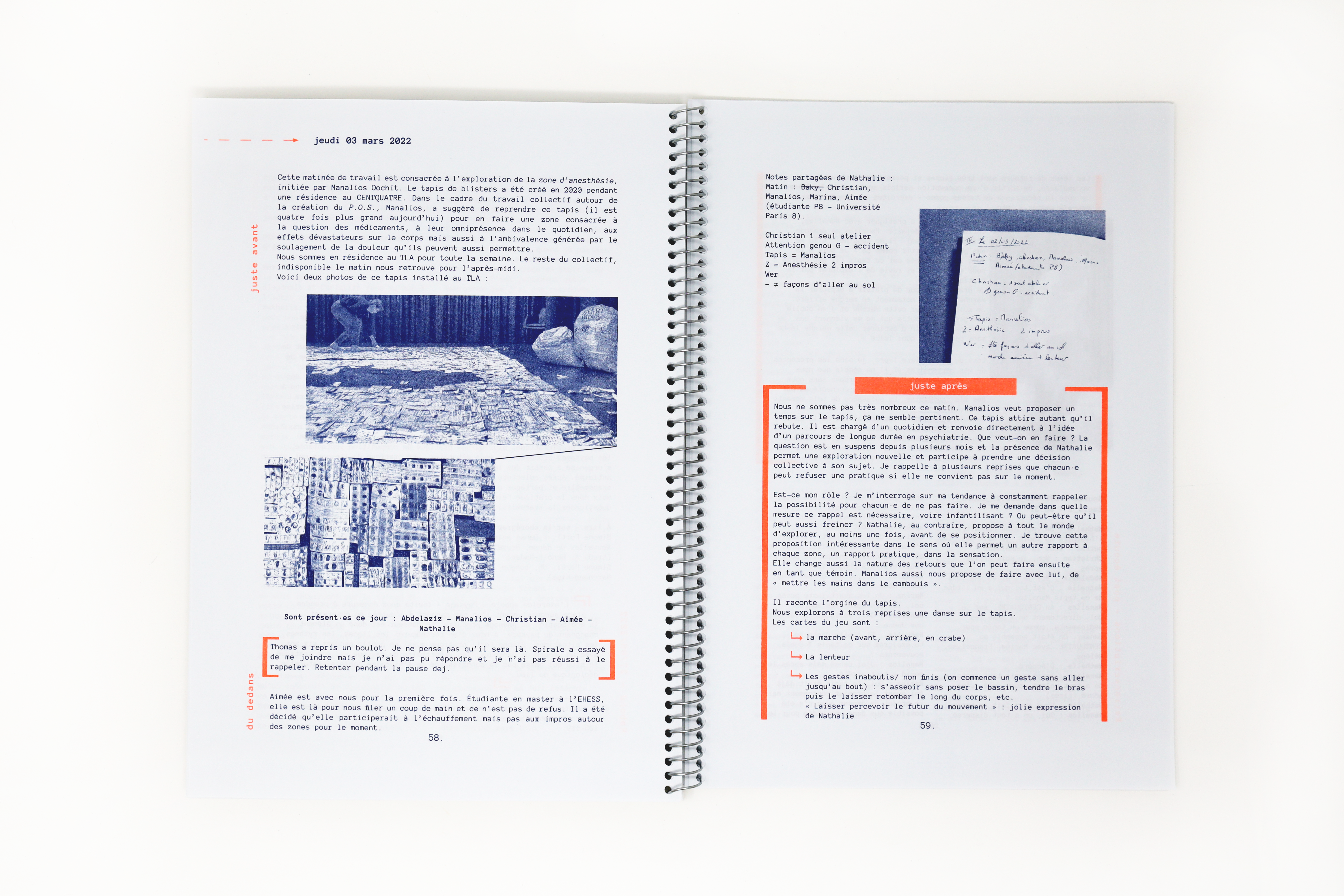 This process of research-creation also draws on literature concerning the gesture of research writing and engages in epistemological inquiry by interweaving various writing and editorial practices. The diaristic writing, research readings, and journals from the Plan d'Occupation des Sols performance aim to reflect the collective’s critical vitality.